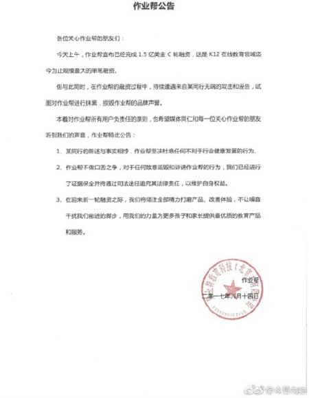 “作业帮”公告 互联网公司打架不是新鲜事,不打架才是新鲜事。从遥远的3Q大战到现在的外卖大战、共享单车大战,网友时不时就要看一场戏。这些打架往往都是节操与狗血齐飞,很多争论最后都不了了之,网友也当看热闹。但这一次,我们这些围观者没有理由继续保持淡定。 因为这次战场是在线教育,而这些平台的受众是中小学生。在线教育概念近年在资本市场上备受追捧,相关公司都堪称财大气粗,融资动辄以亿计。它们争的是市场份额、估值、独角兽,但在这个过程中,不能让孩子成为牺牲品。 在线教育容不得野蛮生长,因为每一个孩子都只有一次成长。当几乎所有主流学习软件都被曝出涉“黄段子”、色情信息的时候,幕后的真相或许有很多种可能,但最重要的是台面上的真相。那就是,这个行业普遍存在疏于监管的情形。 黄段子、色情信息主要出现在评论区、互动区,但这不代表平台方没有责任。学习软件以孩子为受众,在开放评论互动的时候,必须做好监管的准备。单单开通举报渠道,是远远不够的。正如有的家长所说,怎么能指望十来岁的孩子去举报不健康内容?