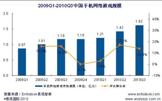 数字:1.6亿 ——Q3中国手游市场 随着3G技术的发展,移动互联网成为新的淘金热点,各细分市场中的移动应用层出不穷,充满无限的机遇和竞争。根据易观数据显示,2010年第3季度中国手机网络游戏市场达到1.6亿,环比增长14%,具体表现如图所示: